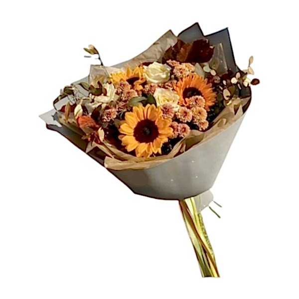 3 adet beyaz gül ayçiçeği ve krızentemlerden oluşan zarif bir çiço çiçeği..